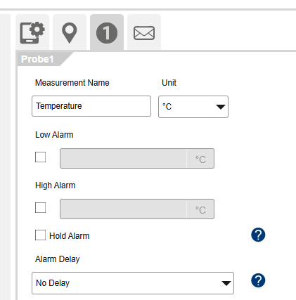 - Alarm delay: hiermee bepaal je hoe lang de afwijking moet aanhouden vooraleer het alarm geactiveerd wordt. Je kan kiezen voor no delay (onmiddellijk alarm) of een vertraging instellen in seconden, minuten of uren — handig om te vermijden dat korte schommelingen (openen deur koelkast bijvoorbeeld) meteen een alarm veroorzaken.